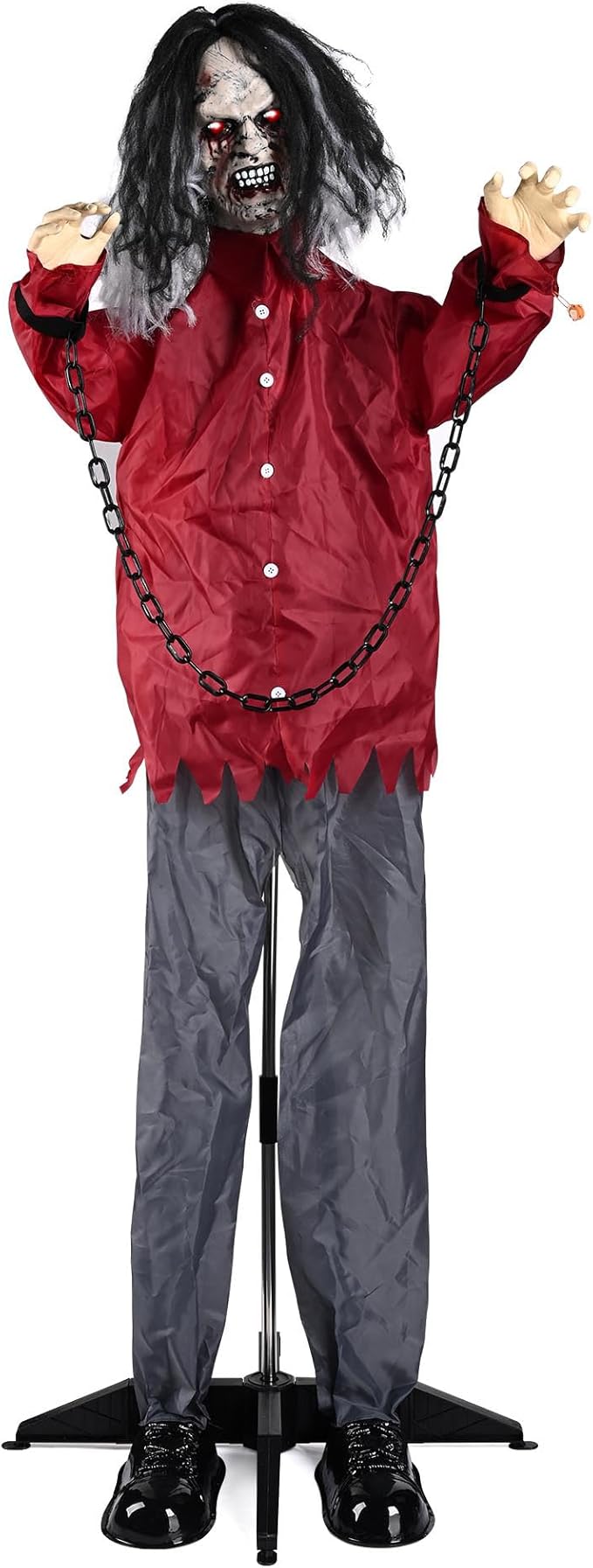 - Sound & Touch Activated - 5 7/12 Ft Standing Animatronic Zombie is sound & touch activated to sway back & forward with its eyes glowing with ghastly red light, and giving out a sound of bone-chilling demon scream to terrify trick-or-treaters, great Halloween prop for setting a horrible scene & creating a spooky atmosphere