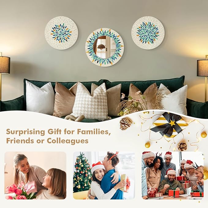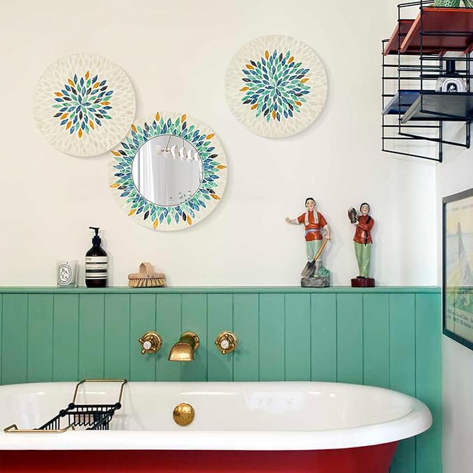 TEIPAI Jewel-Tone Mother of Pearl Mirror Wall Decor for Living Room, 3PCS Handmade Round Wall Art for Home Guest Room Decoration, Unique Mosaic Art Gift for Birthday Wedding Housewarming (Colored)