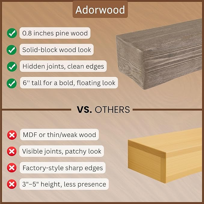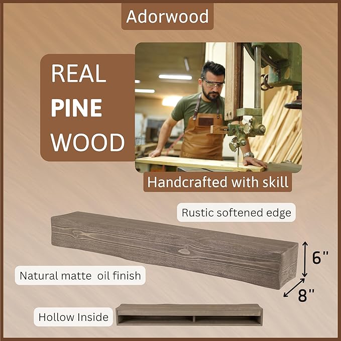 - GENUINE PINE WOOD TEXTURE: Each piece reveals natural knots, small cracks, and unique distressing, ensuring every mantel is one-of-a-kind. Due to the inherent characteristics of real wood, the grain and color may slightly differ from the samples shown.