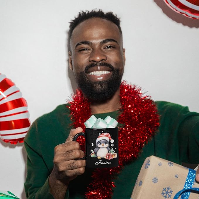 - 💝 UNIQUE DESIGN MUG: Celebrate the holidays with this "Customized Christmas Themed Black Cup" featuring a penguin in a Santa hat surrounded by gifts and festive greenery. Click "Customize Now" to add a name, creating a delightful and personalized gift for the holiday season. This black ceramic mug is great for enjoying your favorite winter beverages.