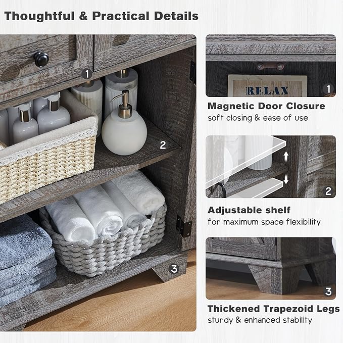 - [Adjustable Shelf]: The adjustable shelf design easily adapts to the size of your belongings, suitable for small and medium items and let your bathroom supplies are no longer a cluttered pile. L-shaped metal bracket have more enhanced support and stability, no need to worry about the shelf tilting. The farmhouse floor cabinet is the embodiment of your sophisticated lifestyle.