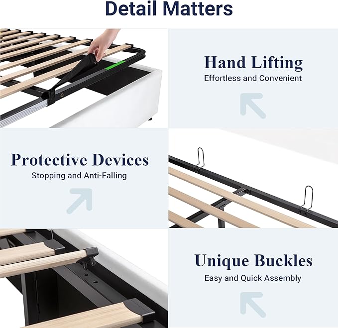 - Space-Saving Storage: With its lifting up storage feature, this bed frame provides ample space to store extra bedding, clothing, shoes, and other items, especially helpful for smaller bedrooms or apartments where storage space is limited