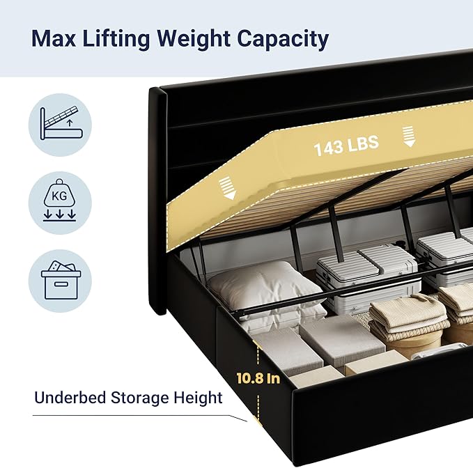 - Space-Saving Storage: With its lifting up storage feature, this bed frame provides ample space to store extra bedding, clothing, shoes, and other items, especially helpful for smaller bedrooms or apartments where storage space is limited