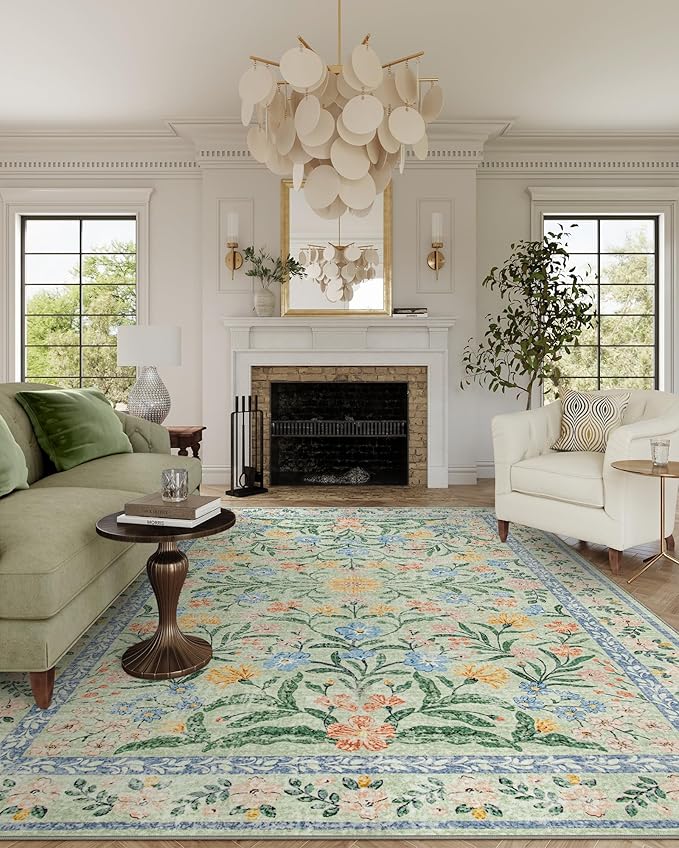 Wonnitar 10x14 Machine Washable Area Rugs, Green Floral Large Rugs for Living Room, Ultra-Thin Foldable Boho Flower Print Bedroom Carpet for Dorm Apartment Office