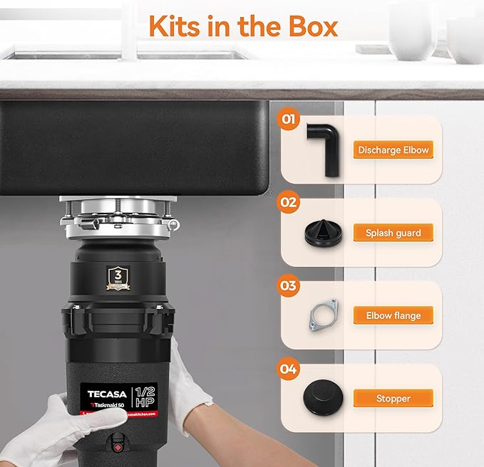 1/2 HP Garbage Disposal, TECASA Food Garbage Disposal with Power Cord, Stainless Steel Grinding System and 3-Bolt Mounting, Continuous Feed Compact Garbage Disposals, UL Certified, Taskmaid Series 50