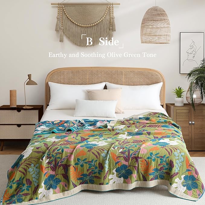 Boho Throw Blanket Full Size, Extra Large Soft Cozy Cotton Muslin Quilt Blanket for Bed Decor, Floral Patterned Couch Sofa Chair Cover, Vintage Farmhouse Cottage Woven Blanket, Teal&Green