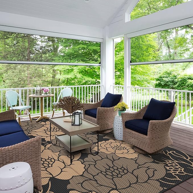 GENIMO Outdoor Rug Waterproof for Patio Decor, 8' x 10' Reversible Plastic Straw Floral Camping Carpet, Large Area Rugs Mats for RV, Camper, Deck, Balcony, Porch, Beach, Picnic, Mix-Black & Brown