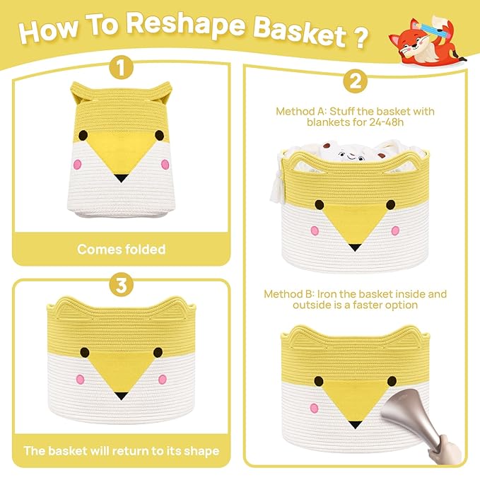 - 【Note】The baby blanket baskets arrive folded, but please don’t worry—this is not a quality issue. You can check out the videos we uploaded. Fill it with blankets and quilt in 24 to 48 hours to make it look round. Then iron the creased places inside and outside the basket. It'll get back to its best shape. This is a basket you’ll use for years. We’ve put a lot of care and love into designing these baskets, and you can trust the quality and craftsmanship.