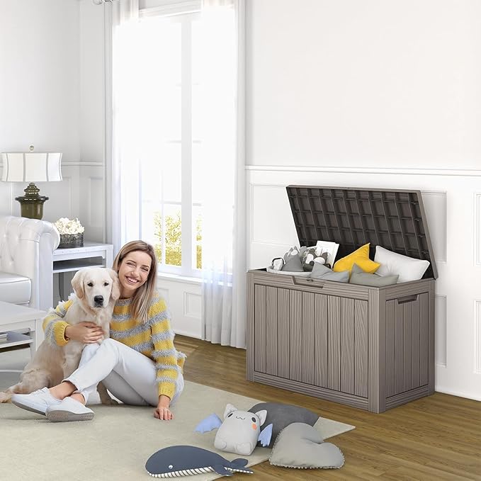 - TRANSFORM YOUR SPACE: Whether used indoors as a laundry storage solution or outdoors for patio items like cushions, garden tools, and sports gear, this patio storage box excels. Its multi-functional design makes it suitable as a side table, patio seat, storage bench, or footstool