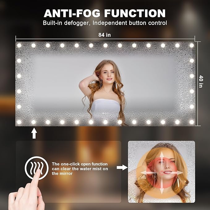 - 【Hollywood Design with Full Illumination】This modern bathroom mirror features a 84" x 40" HD glass mirror with a Hollywood-style design and 34 LED bulbs, delivering even, shadow-free lighting. Its frameless design and elegant Hollywood aesthetic bring style and functionality to any luxurious bathroom décor.