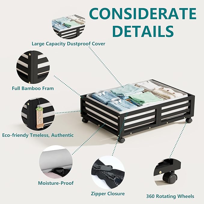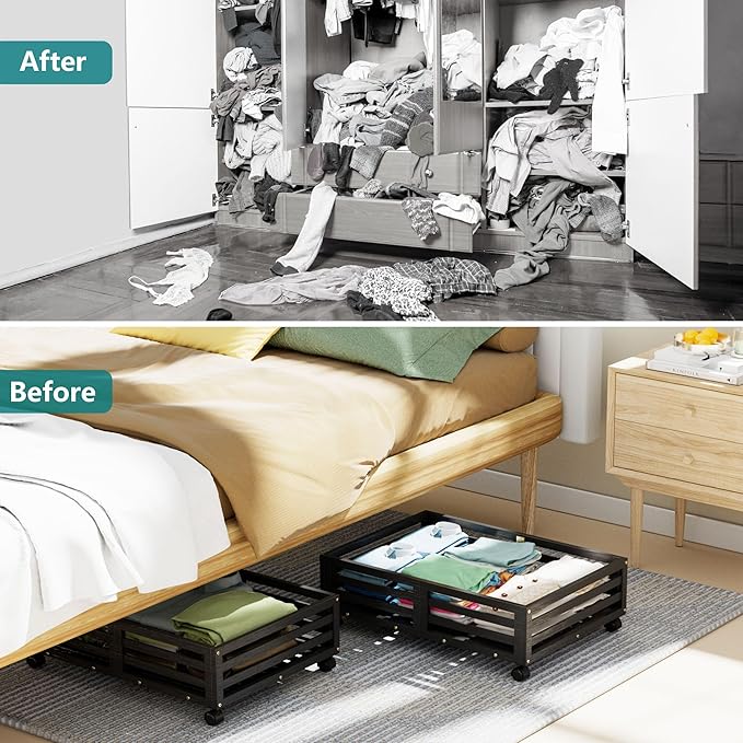 - 👍[Sturdy and Durable] Our under bed storage with wheels is crafted from premium wood bamboo, boasting 4 rotating wheels and a capacity of 120lbs. This 'under bed storage' solution includes non-woven bags for efficient organization of clothes, books, shoes, and toys.