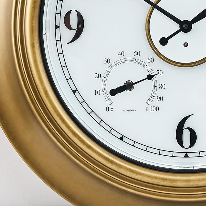 ANDY STAR 21 Inch Outdoor Clocks Waterproof, Large Outdoor Wall Clocks for Patio with Thermometer, Weatherproof Illuminated Clock Battery Operated with Thermometer&Hygrometer, Gold Metal Finish