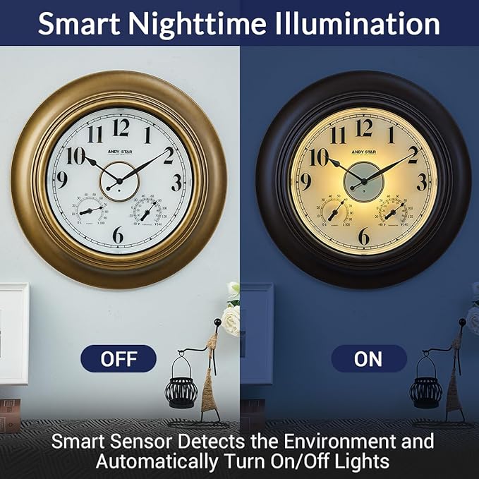 - Smart Light Sensor Technology: This 21 inch outdoor clock with temperature automatically illuminates with a warm backlight in the dark. It's easy to read from afar even then; The smart sensor lights up a warm glow at night and turns off in daylight;Select from Always On, Off, or 4 - hour timer backlight modes