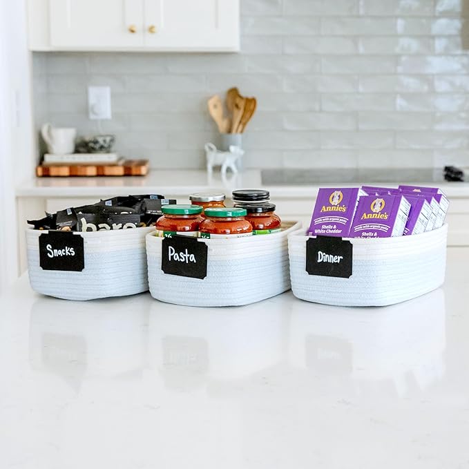 - Safe, Natural Cotton Organizer Bins: Crafted from the highest quality material in the market, our storage bins are oh-so-sturdy (and cute) and ready to take on little humans. They’re 100% safe, so you can rest easy if teething toddlers take a nibble. Reinforced Hidden Handles: Now you see ‘em, now you don’t! With completely hidden handles that blend seamlessly into the rope basket, you’ll be the Houdini of home organizing. They’re even double-stitched and reinforced for extra heavy loads!