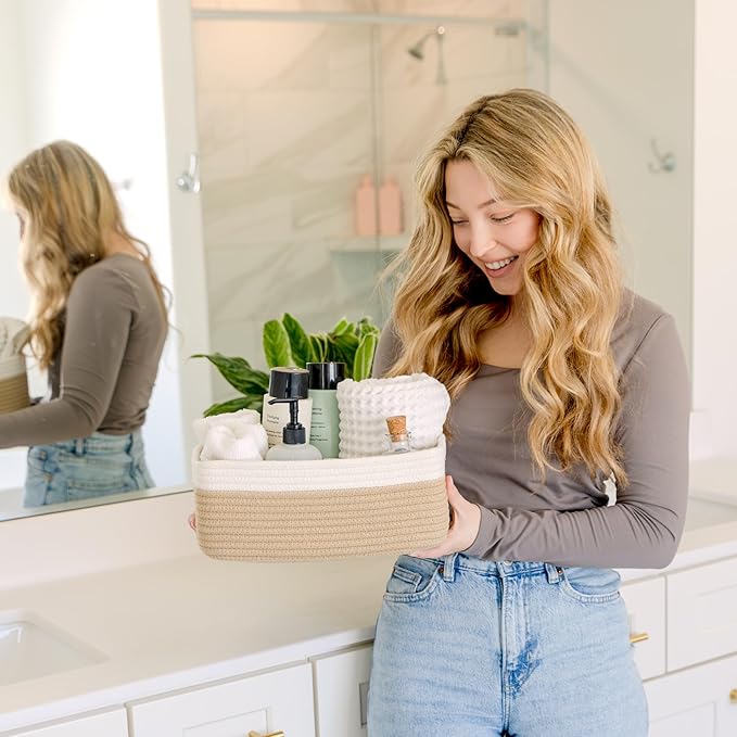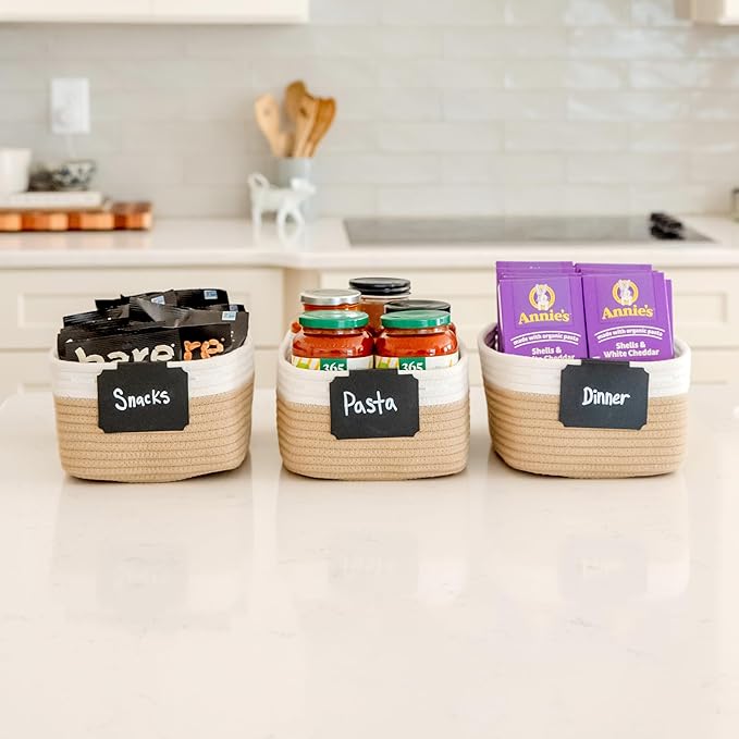 - Safe, Natural Cotton Organizer Bins: Crafted from the highest quality material in the market, our storage bins are oh-so-sturdy (and cute) and ready to take on little humans. They’re 100% safe, so you can rest easy if teething toddlers take a nibble. Reinforced Hidden Handles: Now you see ‘em, now you don’t! With completely hidden handles that blend seamlessly into the rope basket, you’ll be the Houdini of home organizing. They’re even double-stitched and reinforced for extra heavy loads!