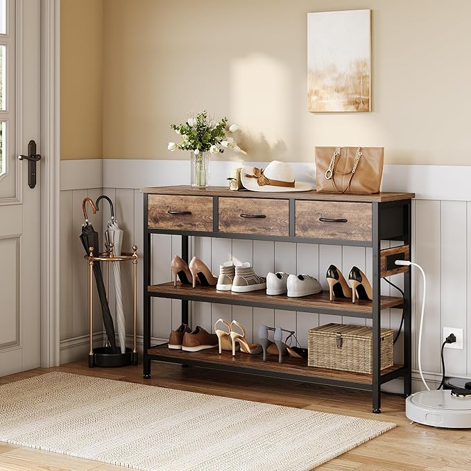 Lulive Entryway Table with Power Outlets, Console Table with 3 Fabric Drawers, Sofa Table for Living Room, Hallway, Couch, Foyer, Height Adjustable (Rustic Brown, 43")