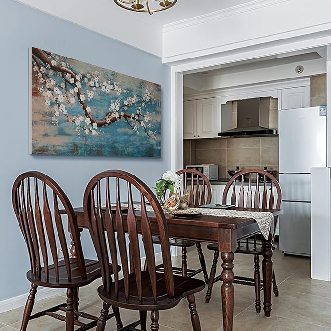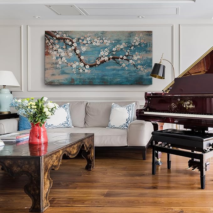 Large Canvas Wall Art for Living Room- 100% Hand-Painted Oil Painting with Texture, Extra Large Gallery Wrapped Floral Plum Blossom Tree Artwork Blue Teal Lake Wall Picture for Bedroom, Office Decor