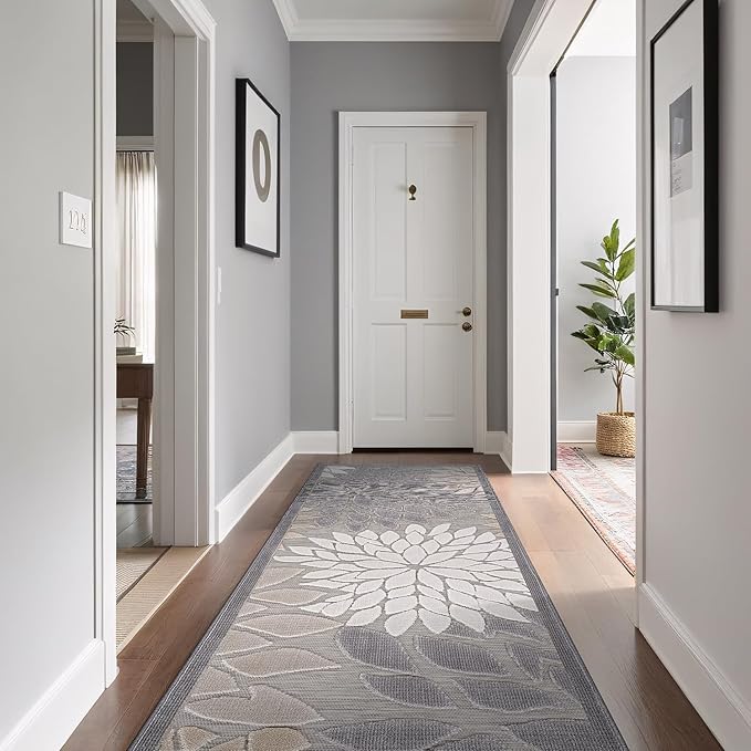 Beverly Rug Outdoor Runner Rug 2x7 Modern Floral Tropical Area Rugs for Indoor and Outdoor Patio Easy to Clean Non Shedding Living Room Porch Garden Washable Outside Carpet (2 x 7 Gray)