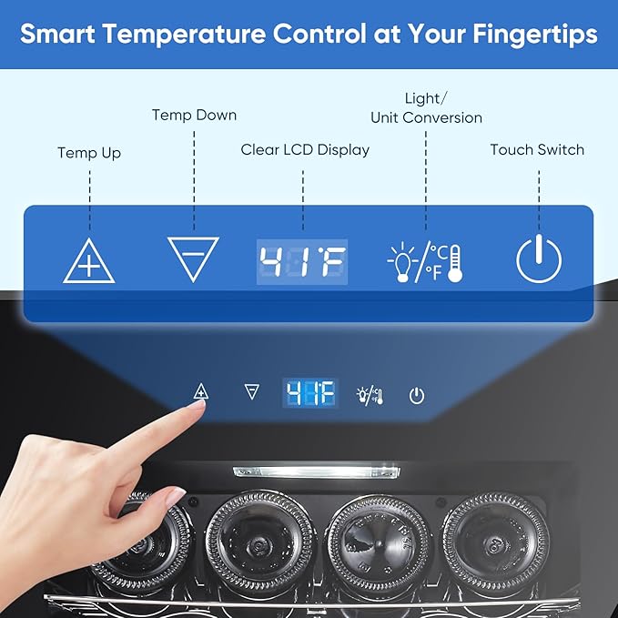 - Easy Digital Control Panel: The ORYMUSE wine fridge features an easy-to-use digital control panel with a clear LCD display. Adjusting the temperature is simple, and the LCD screen displays the current settings, allowing you to monitor and modify the temperature without opening the door. This helps maintain the internal environment, ensuring your wine stays in ideal conditions without fluctuations.