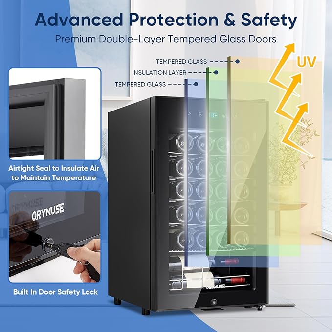 - Lockable Door & Quiet, Energy-Efficient Operation: The ORYMUSE wine fridge features a lockable door, ensuring it stays securely closed to prevent accidental openings. This provides added safety for your wine collection. The fridge operates quietly and is energy-efficient, using less power while maintaining optimal cooling. It’s the perfect solution for reliable and eco-friendly wine storage in your home, office, or any space.