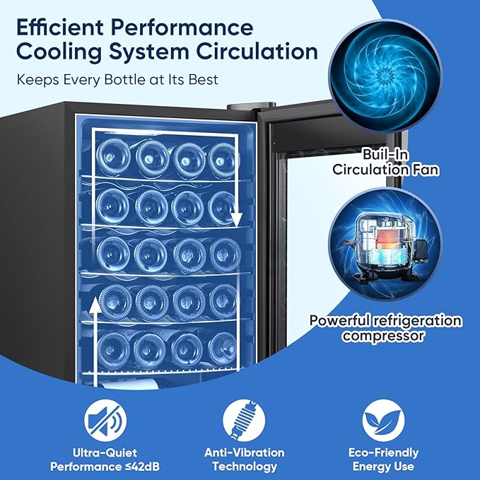- Efficient Compressor Cooling: The ORYMUSE 24 Bottle Wine Fridge uses advanced compressor cooling for rapid, efficient temperature control. With a range of 41°F to 64°F, it maintains the perfect conditions for reds, whites, and sparkling wines. Unlike thermoelectric coolers, the compressor system offers faster cooling and better temperature stability, ensuring your wine is stored at the ideal temperature for flavor and aroma preservation.