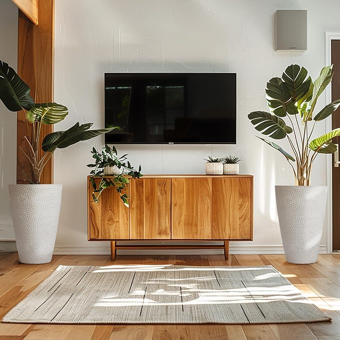 - LARGE TREE PLANTER - This spacious indoor set of 2 planters give you more creative freedom for your different gardening needs. You will love them showcasing large plants such as a snake plant, spider plant, monstera, philodendron, ficus, or other small trees in your front door entrance, living room, or office. Size:13.8”(D)x 20”(H). Soil Capacity: 7.7 gallon per planter. (Plants are not included)