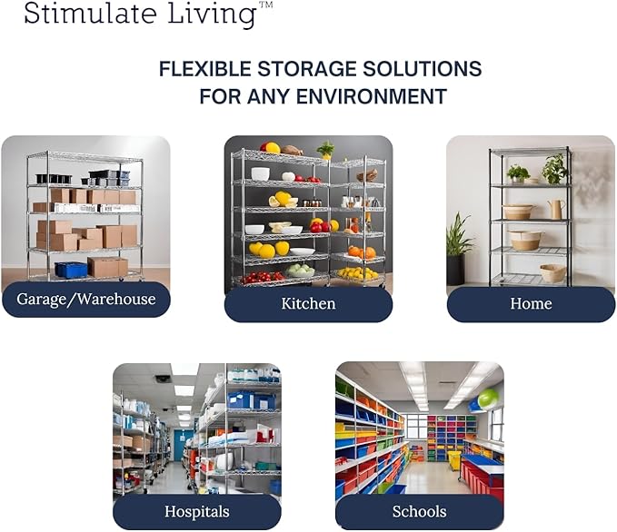 - ★FLEXIBLE USAGE★ Our Stimulate Living Wire Shelving is designed to be flexible and adaptable to a wide range of settings. It can be used in warehouses to store heavy equipment, in kitchens to hold cooking utensils, in garages to organize tools, in hospitals and laboratories to store medical supplies, in offices to keep files and documents, in retail stores to display merchandise, in restaurants to store kitchenware, in factories to hold raw materials, and more.