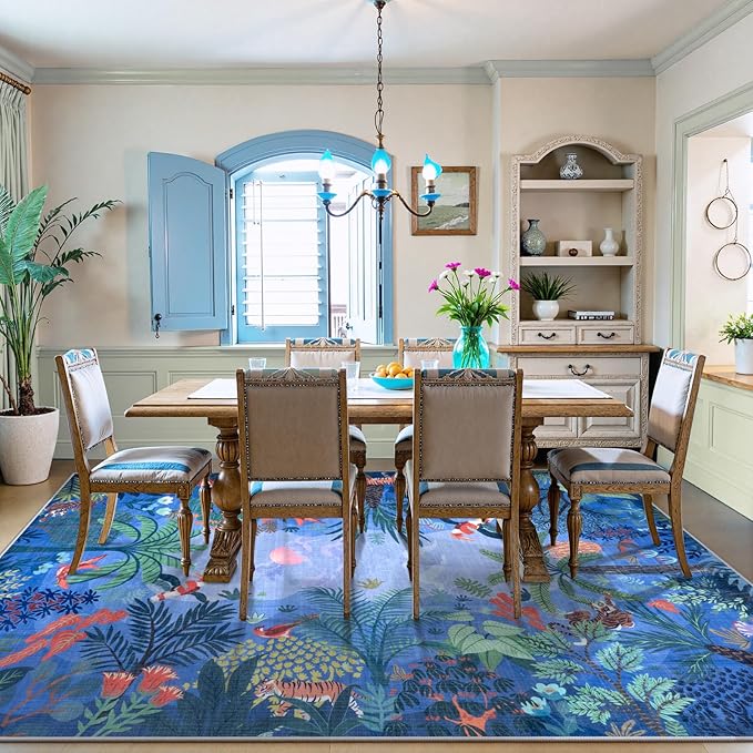 - 【Soft Material with Ideal Thickness】:Made from low-pile polyester, the rug feels soft yet durable. Its balanced thickness provides comfort without bulk, making it an ideal blue rugs for everyday use without interfering with door clearance.