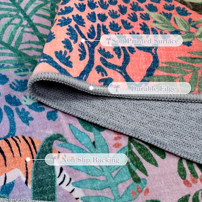 LIVEBOX Washable 6x9 Rug for Living Room, Soft Jungle Animal Print Rugs for Bedroom Aesthetic, Non Slip Purple Boho Rug Botanical Kids Rugs for Bedroom Girls,Stain Resistant Kid Rug for Playroom