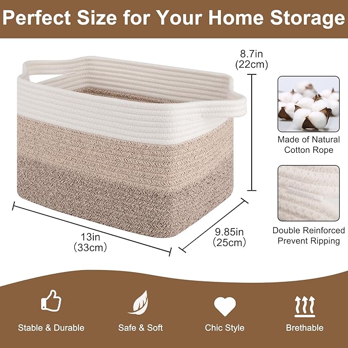 - Multifunctional Storage Basket: 13" x 9.85" x 8.7" shelf basket for organizing, which are designed to fit perfectly on living room, bedroom, bathroom, baby room, office to store household items (towels, toiletries, stuffed animals, books, baby diapers, etc.)