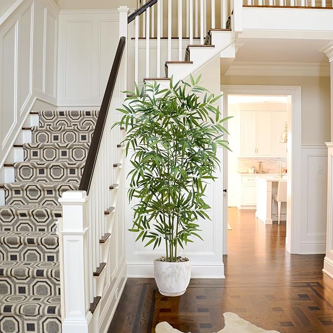 - Ultra-Realistic Indoor Artificial Tree: This 6ft/72in tall artificial bamboo plant has 4 smooth pristine trunks connected with arching bamboo leaves with realistic texture. Inclus a white planter(7"H x 7"W). The interior of the planter is made of sturdy cement and the surface is decorated with non-falling coloured pebbles and the base use anti-tip tilt protection for greater stability