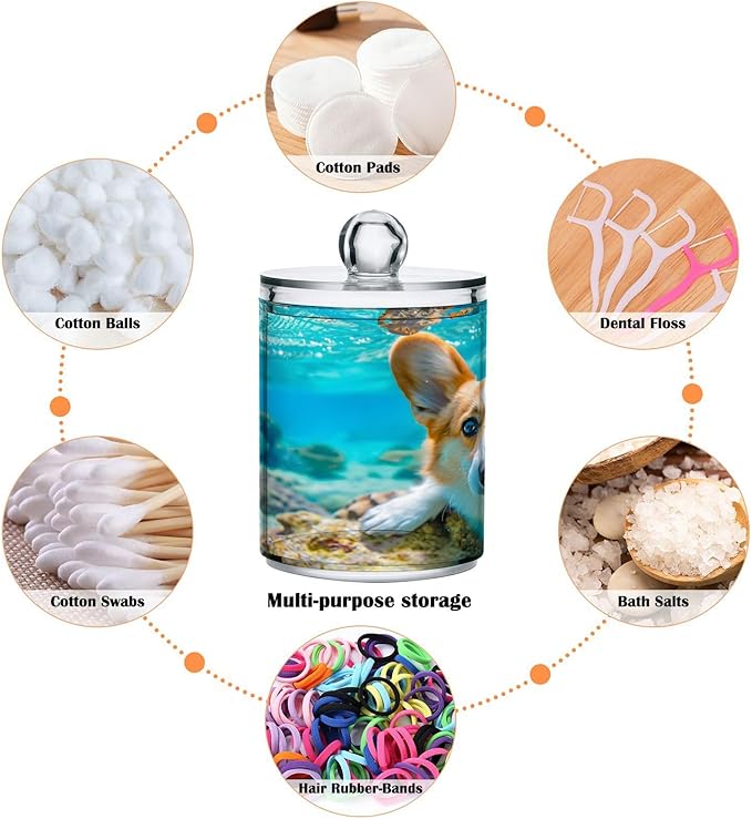 2 Pack Qtip Holder Organizer Dispenser Corgi Dog Underwater Bathroom Storage Canister Cotton Ball Holder Container for Cotton Pads/Swabs/Floss