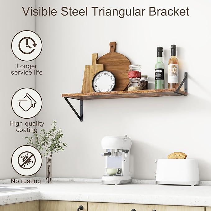 - 【FARMHOUSE RUSTIC WALL SHELF】These floating shelves are made of premium engineered wood board and visible triangular bracket. The rustic wooden grain surface add character and warmth to any modern or traditional interior with these deep floating shelves, contrast shelves at staggering heights on the wall or mount side-by-side or in the corner for a clean streamlined look.