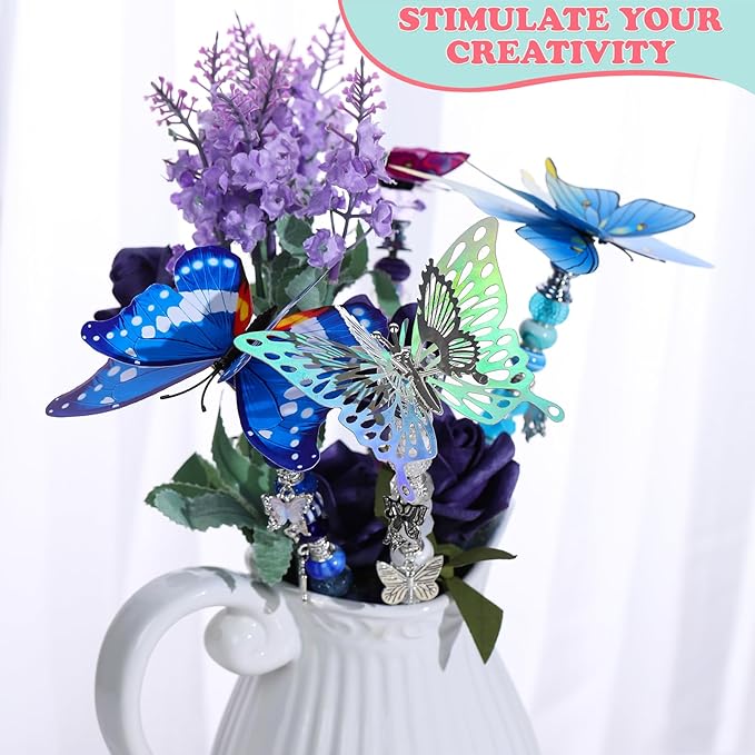 - Package Included: Our butterfly beaded garden stakes are decorated with simulated butterfly accessories that flutter in the wind, with colorful beads to help your garden add more style. You will receive a total of 380 products, including 12 crystal stoppers, 12 10-inch threaded rods, 240 beads, 56 butterfly decorations, 12 screw caps, 20 glue dots