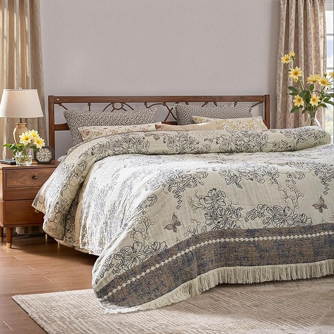 jinchan Boho Floral 100% Cotton Blanket 4-Layer Throw Blanket with Tassel Grey and White Flower Butterfly Soft Luxury Rustic Farmhouse Decor Blanket for Couch Bed 80x90 inch All Season Gift for Women