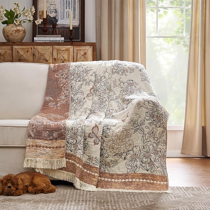 - Elegant Floral Design:This 60x80 blanket features a delicate floral pattern in soft shades of taupe and white. Delicate flowers and butterflies adorn it, bringing a touch of nature's beauty to your space. The fringed border adds a rustic charm