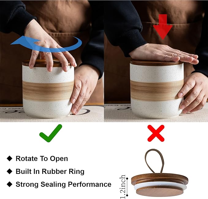 - Rope Cover Design: Each food storage container is equipped with a wooden lid, which has strong sealing and effectively isolates air, moisture, and odors, keeping food dry and fresh, and extending the shelf life of food. There is a unique rope design on the lid, which is easy to open without losing its beauty