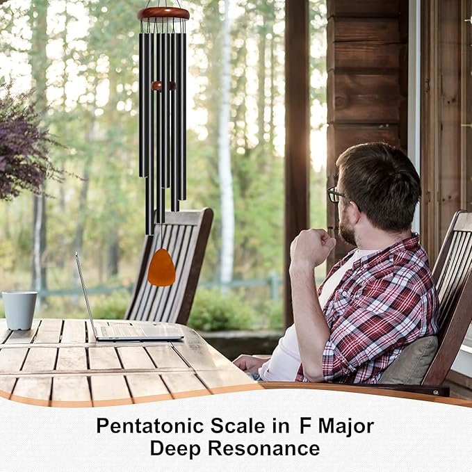 - 50 inch Large Deep Tone Wind Chimes for Outside: This wind chime has a total length of 42 inches and uses a 6-length combination of 18.75/17.7/16.7/15.3/14.4/13.25. The scale is manually adjusted to F major, creating a relaxing and deep tone melody. The tube with diameter of 1 inch and wall thickness of 0.06 inches creates a deep, rich, and aesthetically pleasing sound. When a gentle breeze blows, wind chimes play music like church bells, making you feel relaxed and calm.