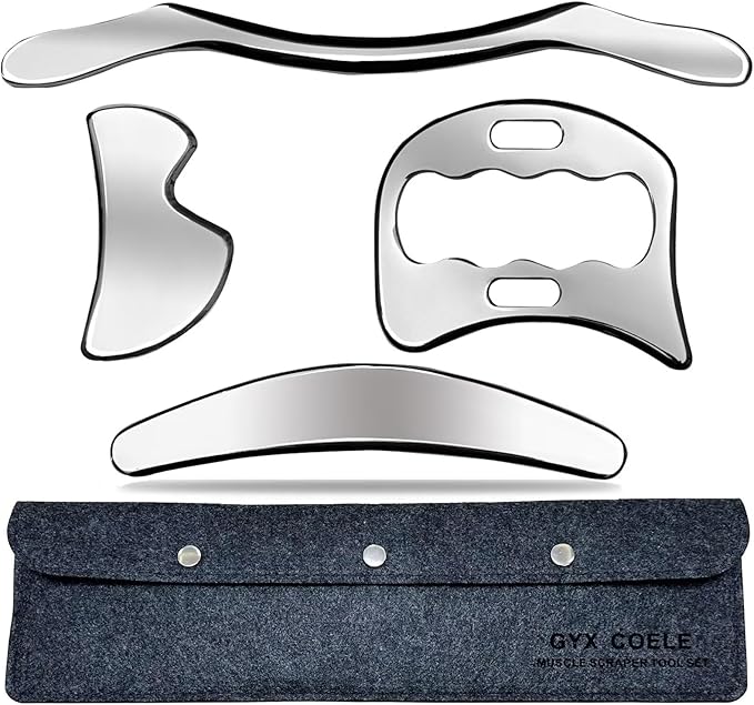 - PROFESSIONAL SET: Complete set of 4 stainless steel scraping tools with different shapes and edges for targeted muscle therapy and massage