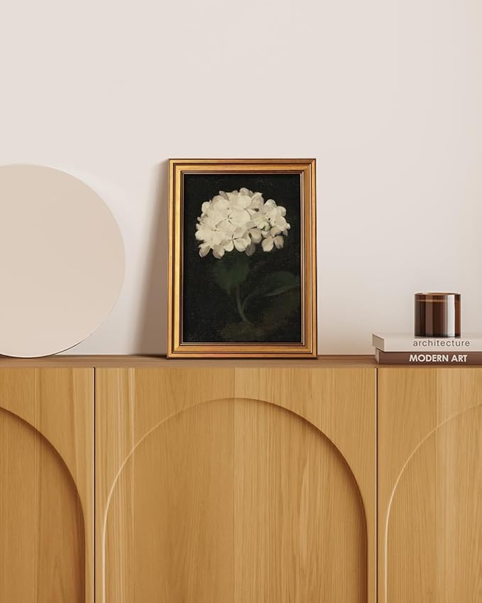 HUARCEY Gold Framed Vintage Wall Art for Living Room, Flowers Painting Canvas Prints Shelf Decor for Kitchen, Aesthetic Bedroom Wall Art, Christmas Gifts for Friends Family (White Hydrangea 12"x16")