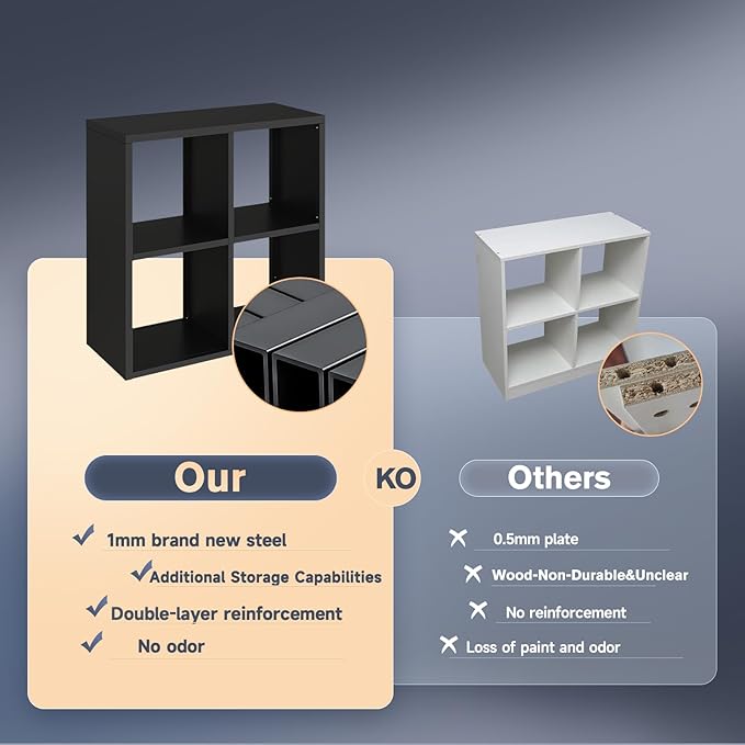 - Odor-Free Metal Furniture:With the latest power coated technology, 4 Cube Storage Organizer is nice and sturdy with no odor. Metal cabinet coated with phosphorus-free powder finish for resistance to chipping, scraping, corrosion and rust. They can adapt to both dry and humid environments, which is convenient for daily cleaning and long-term storage. Selected materials for the safety of family