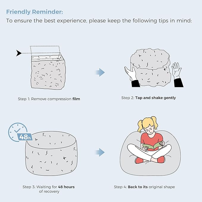 - Bean Bag Rebound: Bean bags take time to rebound, knock and shake to promote recovery and wait 48 hours to return to their original shape, providing cosy furniture for children's rooms