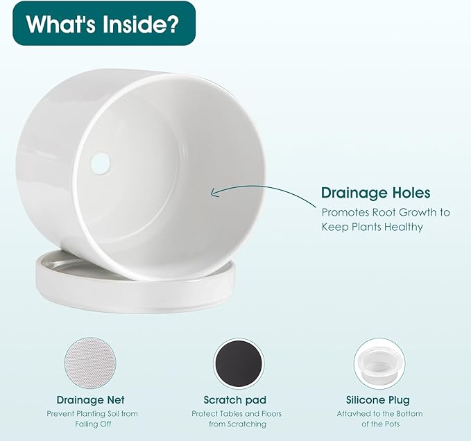- 【Drainage Holes and Trays】This plant pots indoor with drainage paired with leak-proof mesh pads to efficiently remove excess water, prevent soil loss, and avoid waterlogging. The tray collects drained moisture, keeping surfaces dry, while the design promotes healthy root growth—ideal for flowers, pothos, africa violet, snake plant , etc (Note: Tray is attached to the bottom; plant is not included.)