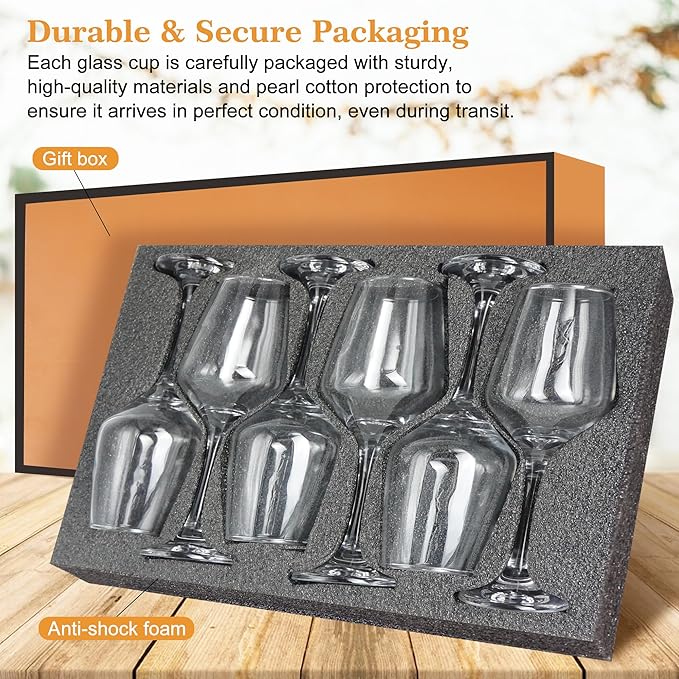 - 【Elegant and Secure Packaging】Glazvia unique clear wine glasses is carefully packaged in an elegant and durable box to ensure safe delivery. The sturdy packaging protects the glasses drinkware during shipping, so you can be confident they will arrive in perfect condition. Whether purchasing for personal use or as a wine glasses gift set, this thoughtful packaging adds an extra touch of sophistication, making the unique wine glasses set of 6 as an wine glass gifts for women.