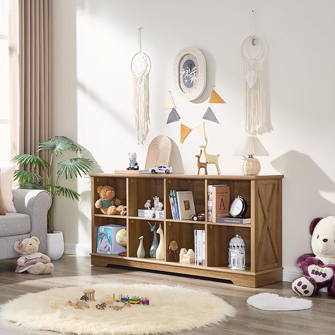 Farmhouse 8 Cube Bookshelf, Storage Organizer Bookcase, Kids Toy Storage Cabinet, Long Bookshelves Storage Organizer Shelf, Wood Display Cabinet Book Shelves for Bedroom,Living Room, Natural Oak