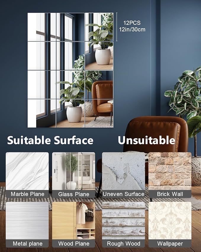 - Clear Imaging Within 0.5m:This 12'' x 12'' mirror set, featuring 12 pieces,The mirror offers clear images within a 0.5-meter range, making it a safe choice for wall decoration. Beyond this distance, image clarity diminishes.