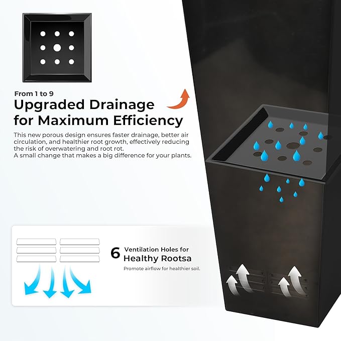 - Elegant Tall Square Design: Featuring a modern tapered silhouette with a high-gloss black finish, these planters bring a sleek and contemporary look to patios, entryways, and interiors.