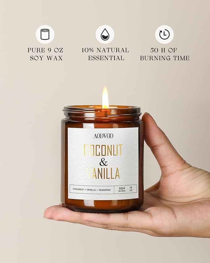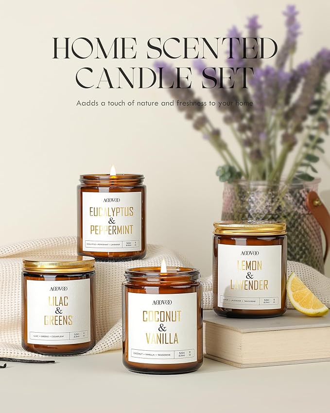 - 4 Pc Scented Candles: Indulge in the sweet Coconut & Vanilla, the revitalizing Eucalyptus & Mint, the calming Lemon & Lavender, and the fresh Lilac & Greens found in our candles. With aoovoo's carefully curated scents, you're in for a one-of-a-kind aromatherapy journey.