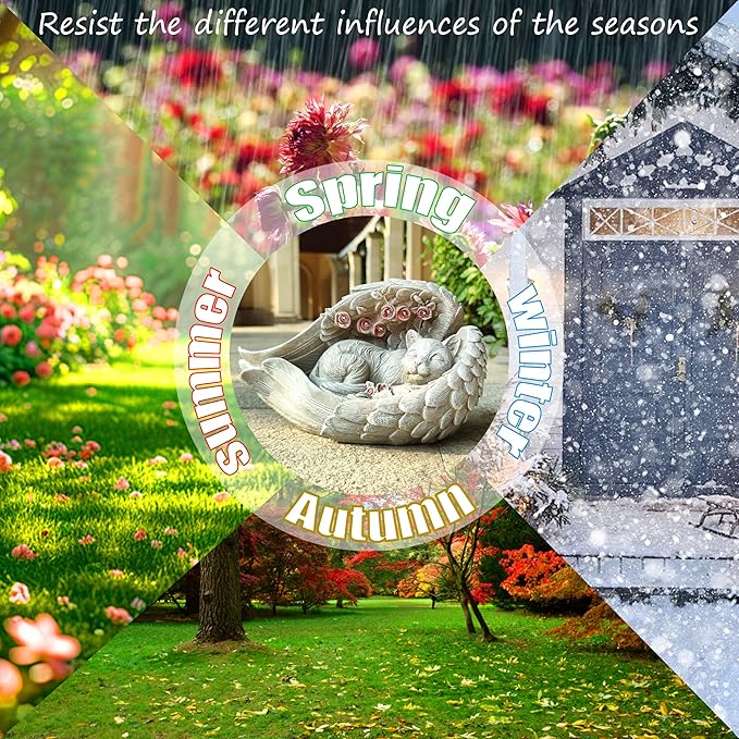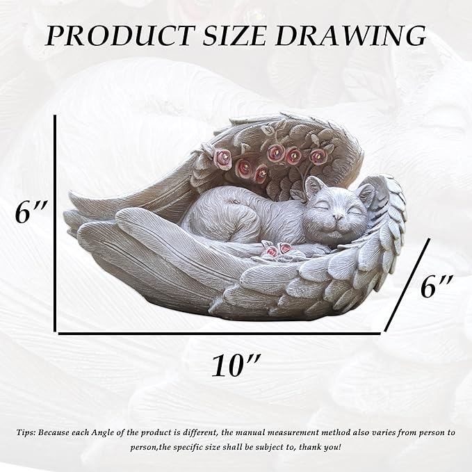 - 【Product Design】Our solar cat memorial a peaceful sleeping cat figurine with feathered and flowered angel wings, creating a beautiful and meaningful way to honor and remember beloved pets. The cat measures 10X6.3X6 inches,Our pet memorial stones a thoughtful and heartwarming way to honor the life and memory of your furry friend.Made from resin
