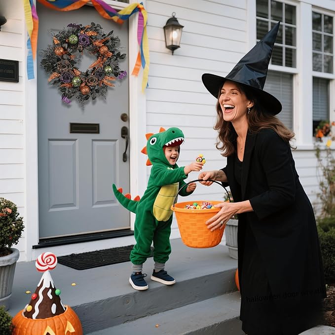 - Halloween Wreath for Front Door: Make a statement with this Pudate 22 Inch Halloween Wreath! Perfect as a Halloween Wreath for Front Door, it features glittery black and purple roses, eerie bats, and sparkling ornaments for a touch of gothic glam